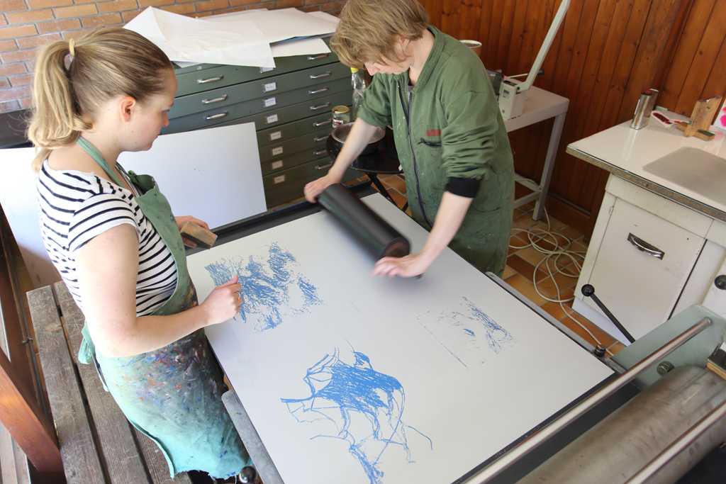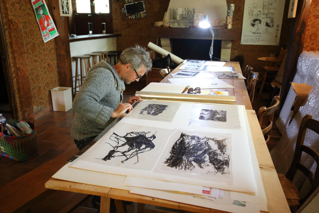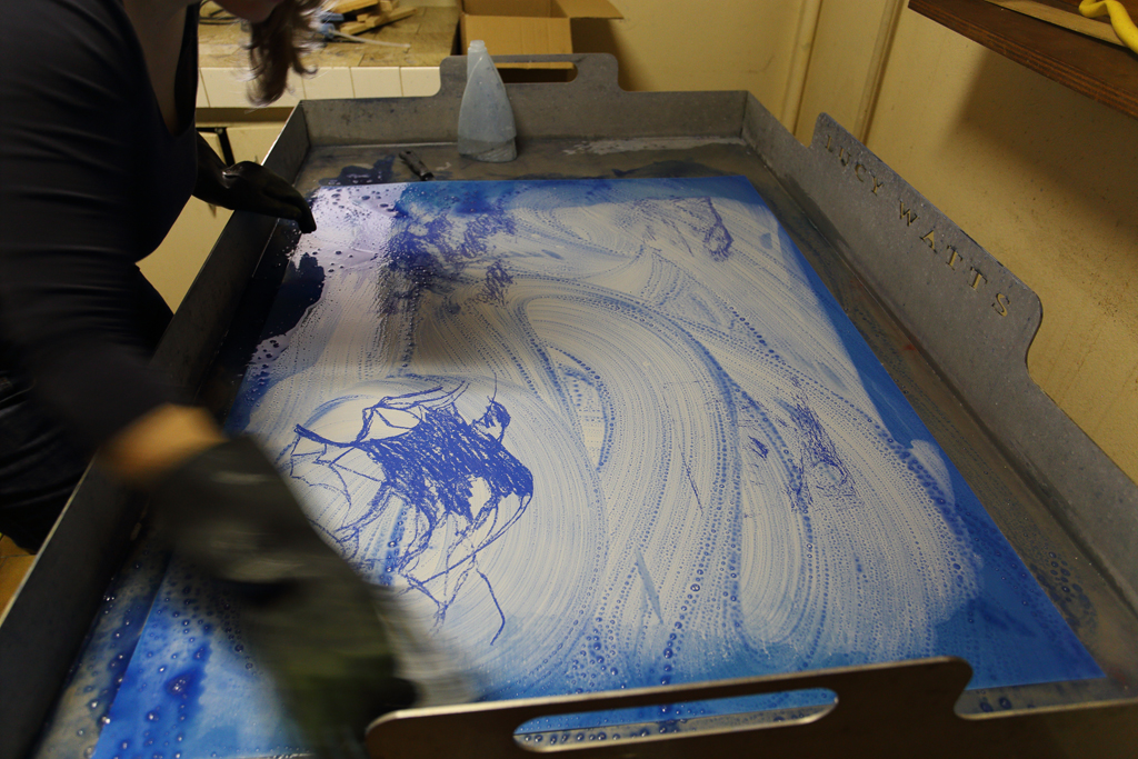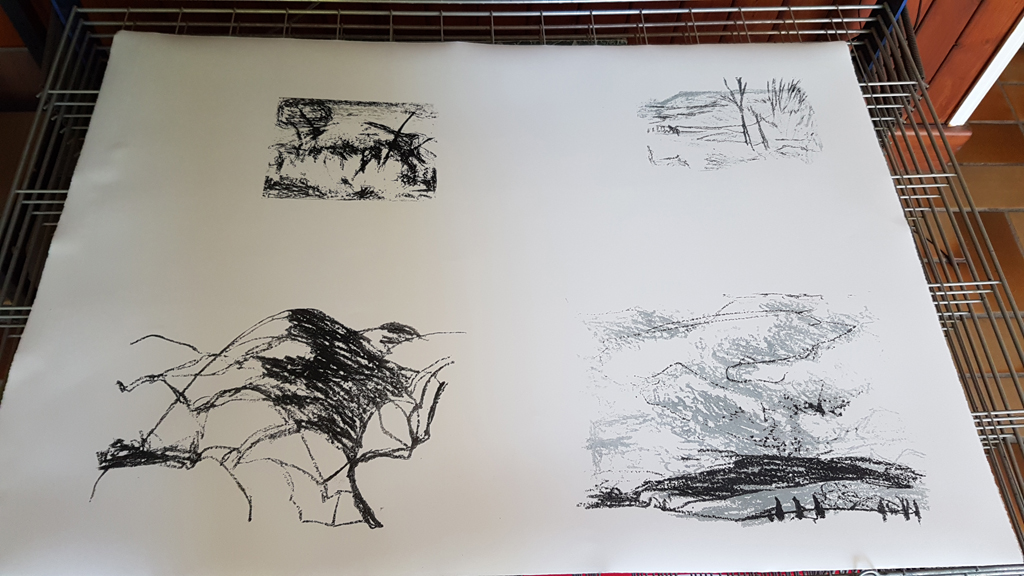 À l’invitation de l’artiste Lucy Watts pour imprimer des alugraphies, j’ai débuté en dessinant au pastel gras sur du papier transparent les paysages le long de la route menant de mon atelier au sien. Ensuite, elle a utilisé ces dessins préparatoires comme support pour créer des impressions de haute qualité grâce à son expertise technique et à son matériel professionnel.